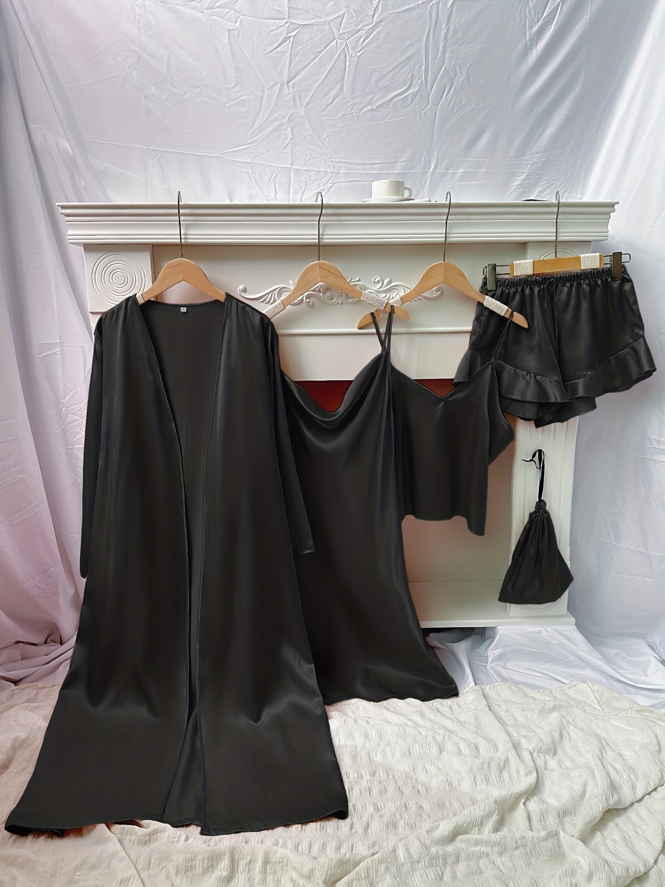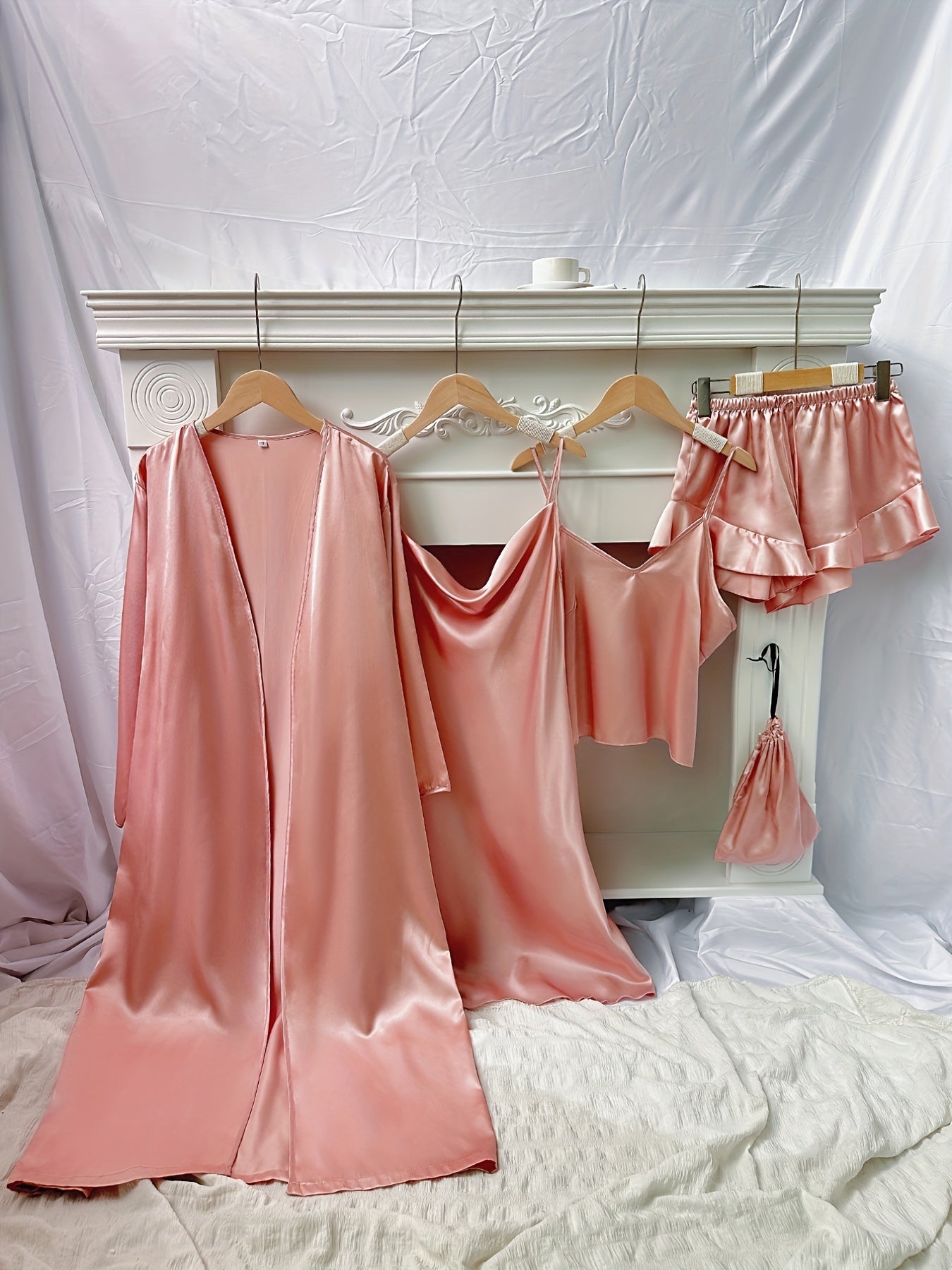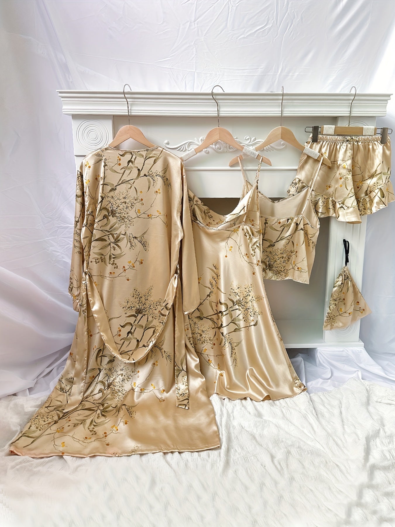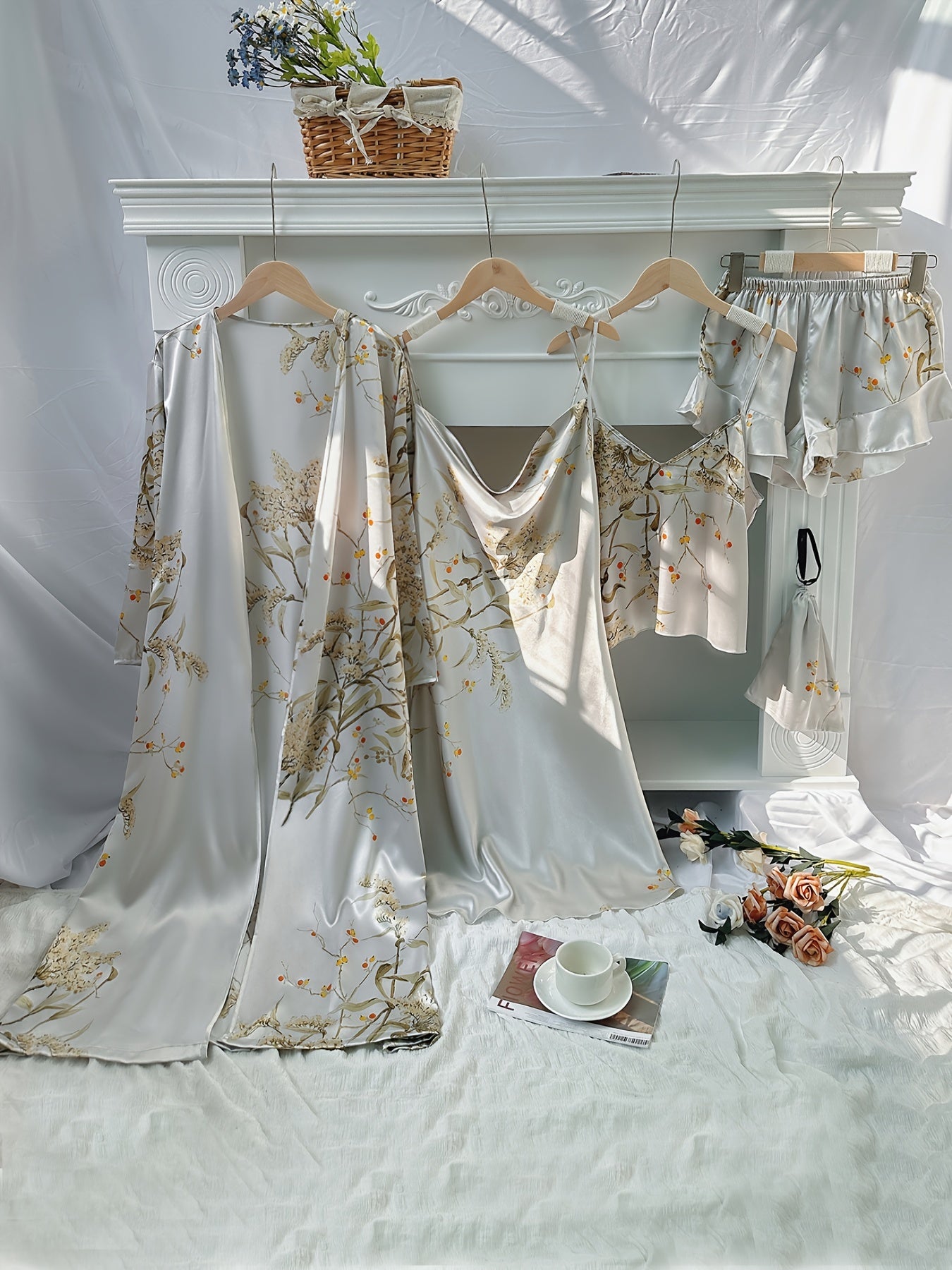 4pcs Floral Print Pajamas Set, Long Sleeve Robe + Cami Dress + Cami Top + Ruffle Hem Shorts, Women's Loungewear & Sleepwear